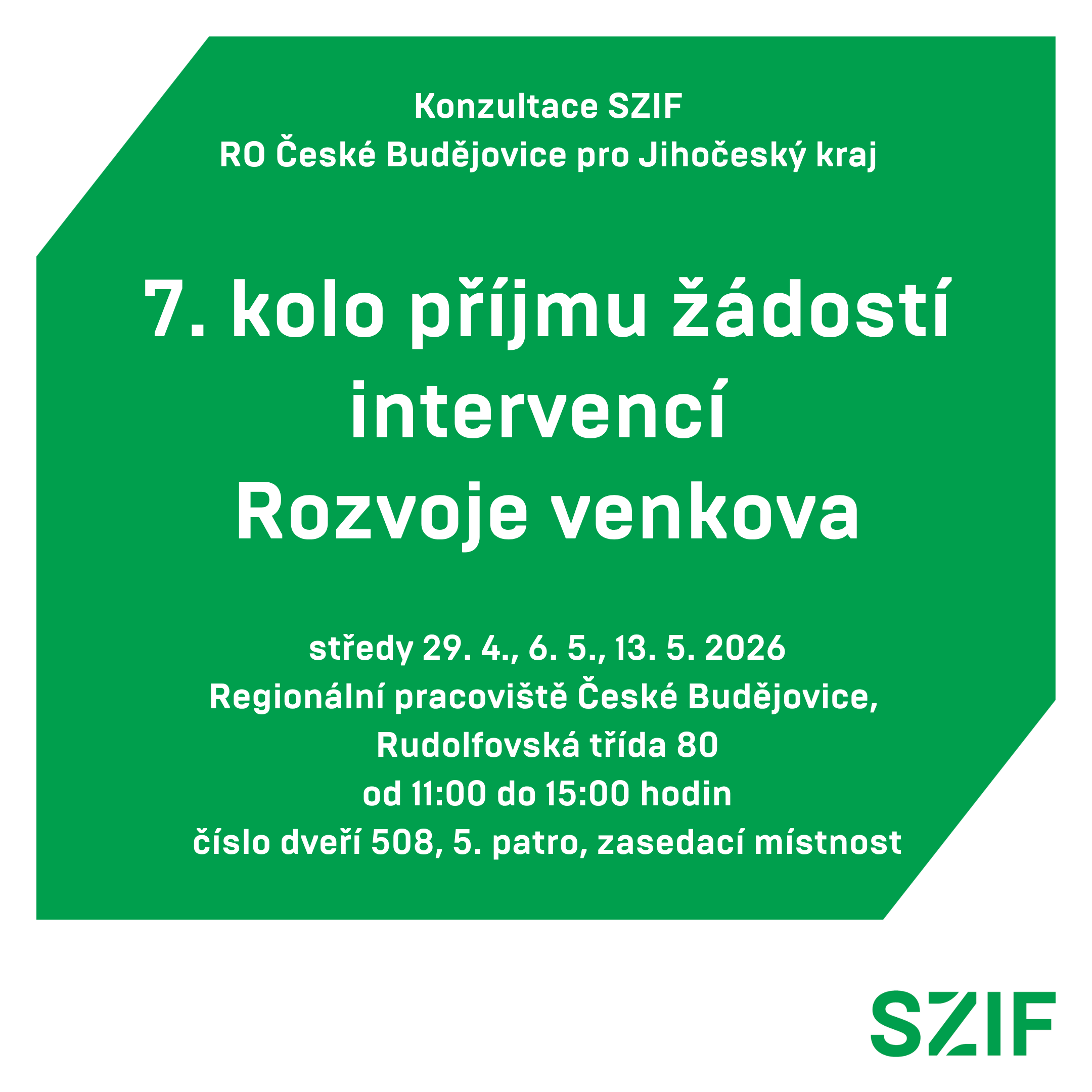Ve dnech 29. 4., 6. 5. a 13. 5. 2026 se uskuteční konzultace SZIF k 7. kolu příjmu žádostí intervencí rozvoje venkova SP SZP - RO České Budějovice.