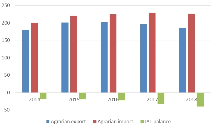 In 2018 the turnover from Czech international agrarian trade (IAT) decreased as well as in previous year. Exports achieved a year on year decrease of CZK 10 bn., i.e. 5 %, imports saw an increase of CZK 2.2 bn., i.e. 0.9 %. As a result of this development the annual deficit for Czech IAT deepened by 24 % to CZK 40.3 bn. The degree of import coverage by exports fell slightly by 3.6 p.p. to 82.2 %. As well as in the previous two years the negative trade balance with the EU 28 worsen also in 2018 when deepen by CZK 7.3 billion (43 %). In contrast, in the case of third countries, the trade deficit fell by 4.6 % to CZK 15.7 billion