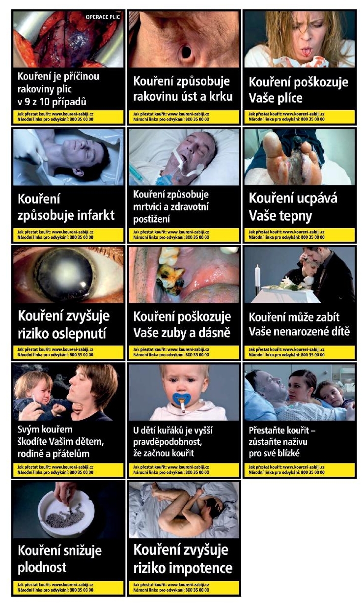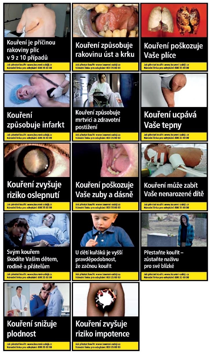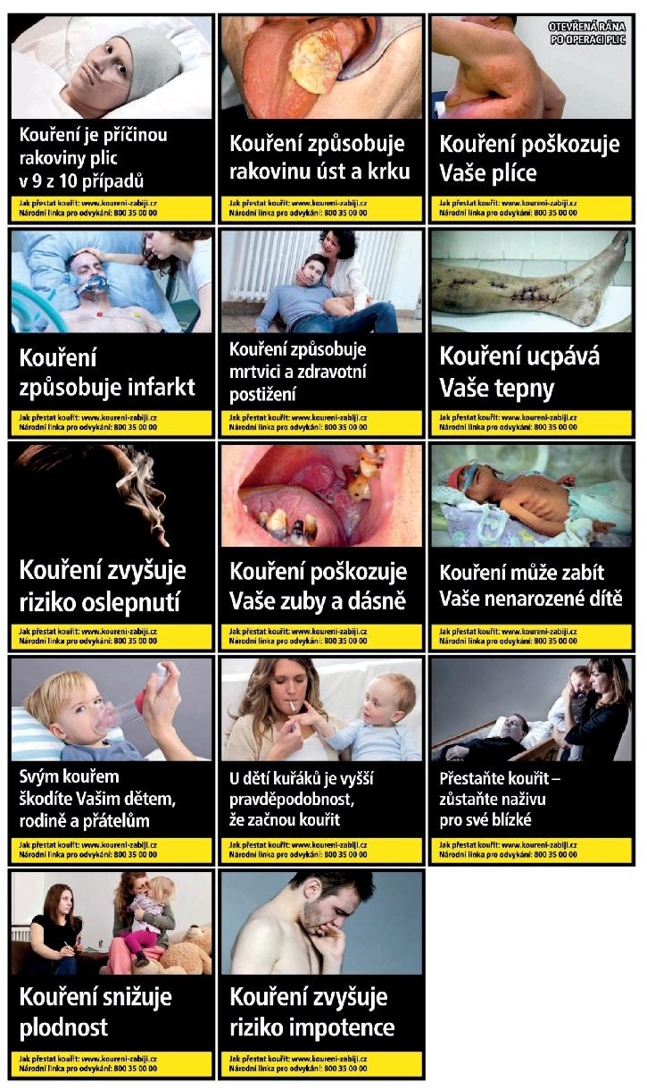 varování, znějí "Jak přestat kouřit: www.koureni-zabiji.cz" a "Národní linka pro