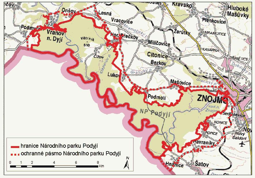 Na západě začíná hranice ochranného pásma národního parku Podyjí na státní