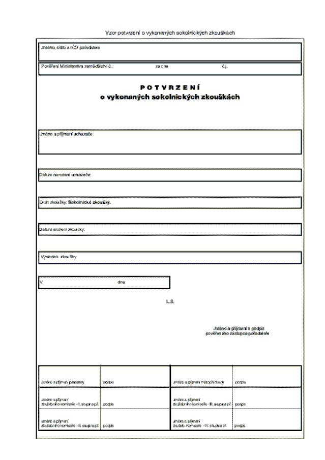 Vzor potvrzení o vykonaných sokolnických zkouškách