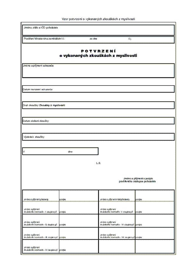 Vzor potvrzení o vykonaných zkouškách z myslivosti