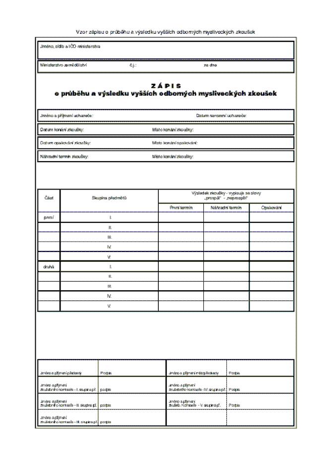 Právní předpisyVzor zápisu o průběhu a výsledku vyšších odborných mysliveckých zkoušek