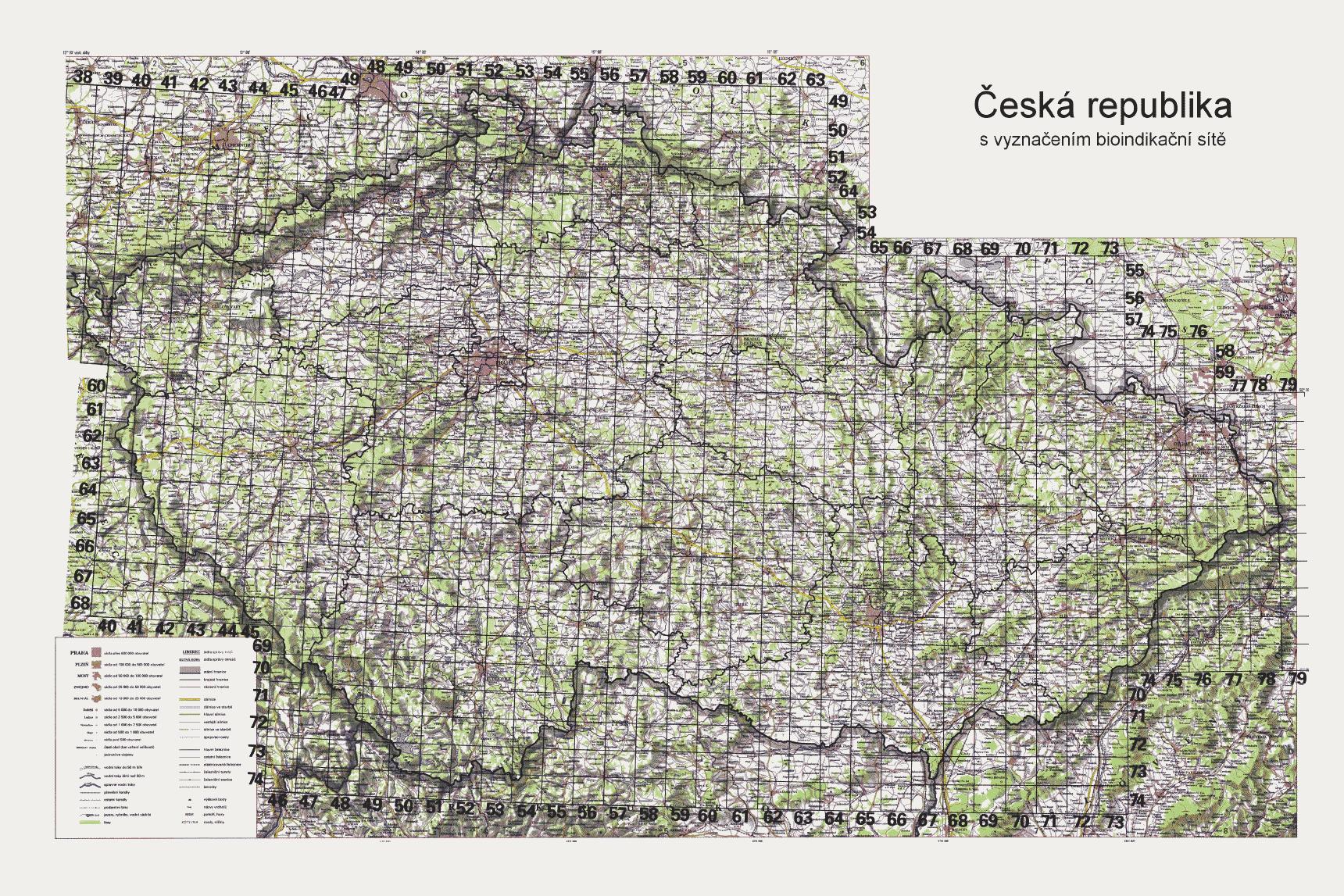 Česká republika s vyznačením bioindikační sítě
