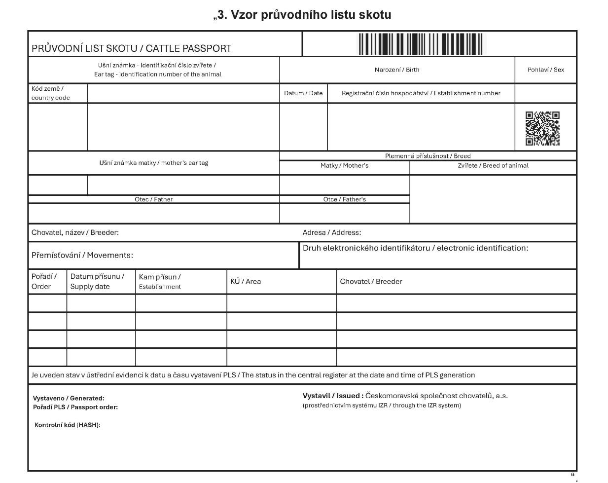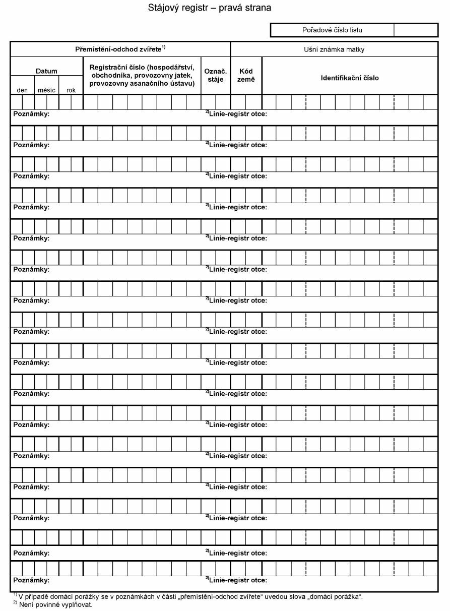 1. Vzor stájového registru turů, ovcí a koz, jelenovitých a velblodovitých