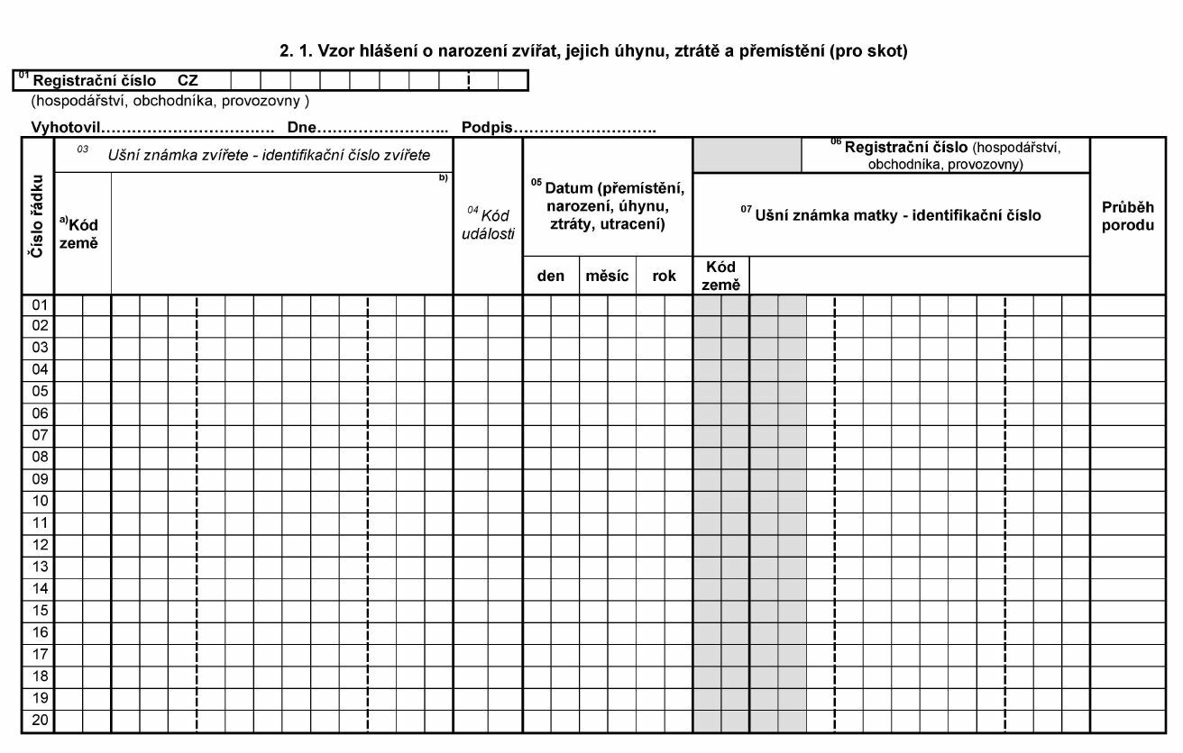 2.1. Vzor hlášení o narození zvířat, jejich úhynu, ztrátě a přemístění (pro
