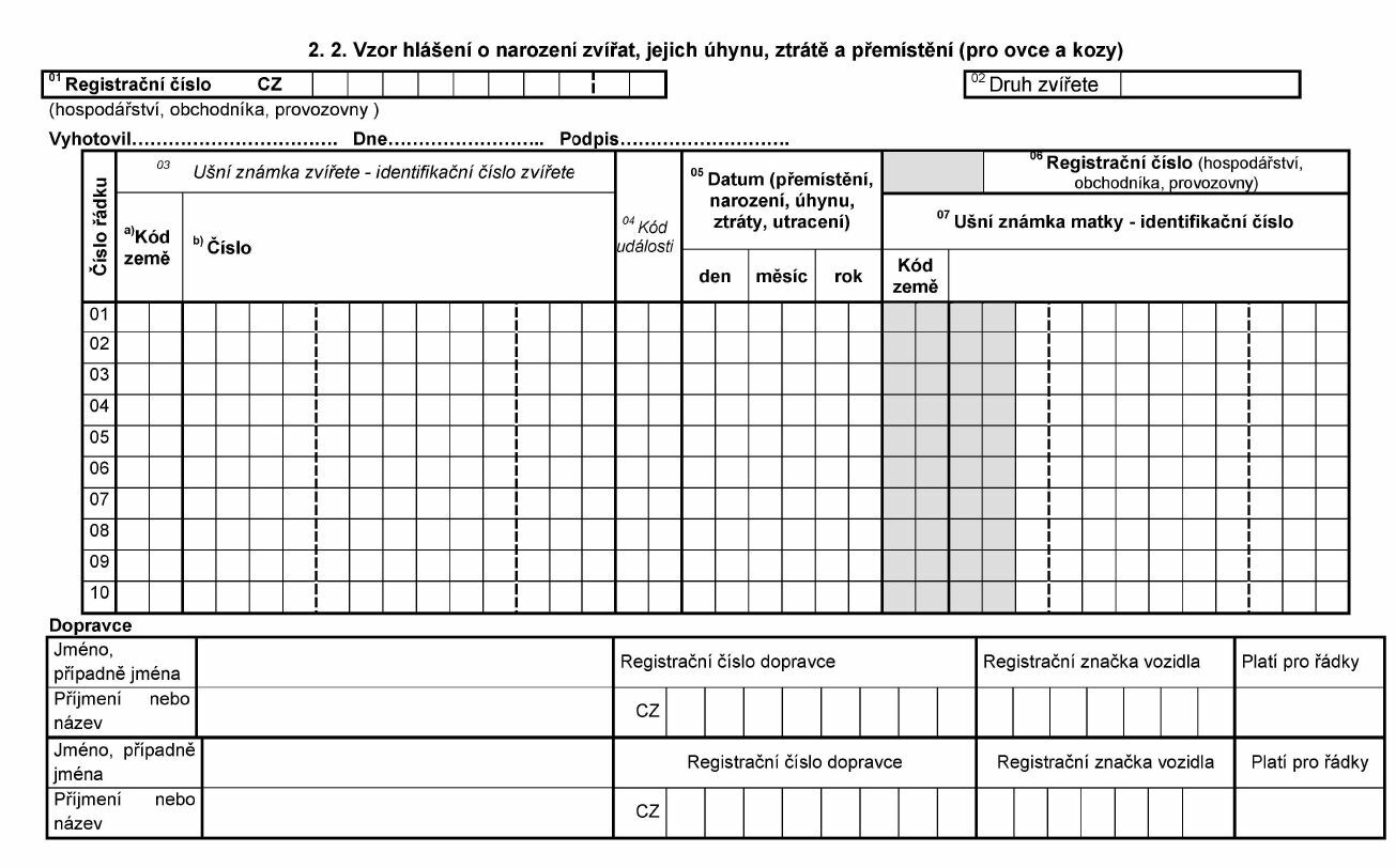 2.2. Vzor hlášení o narození zvířat, jejich úhynu, ztrátě a přemístění (pro