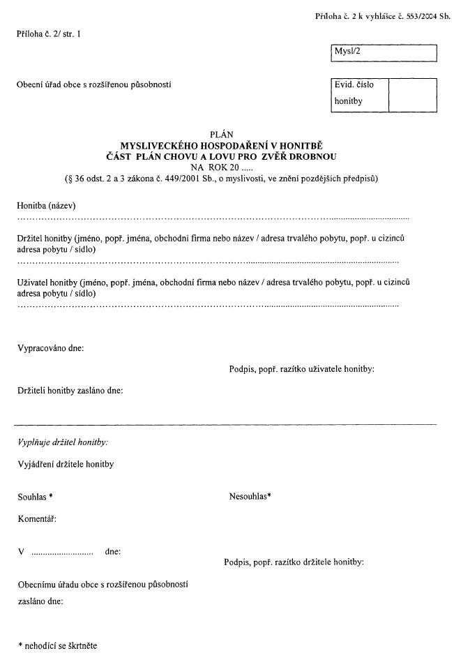 Vyhláška Ministerstva zemědělství č. 553/2004 Sb., o podmínkách, vzoru a bližších pokynech vypracování plánu mysliveckého hospodaření v honitbě