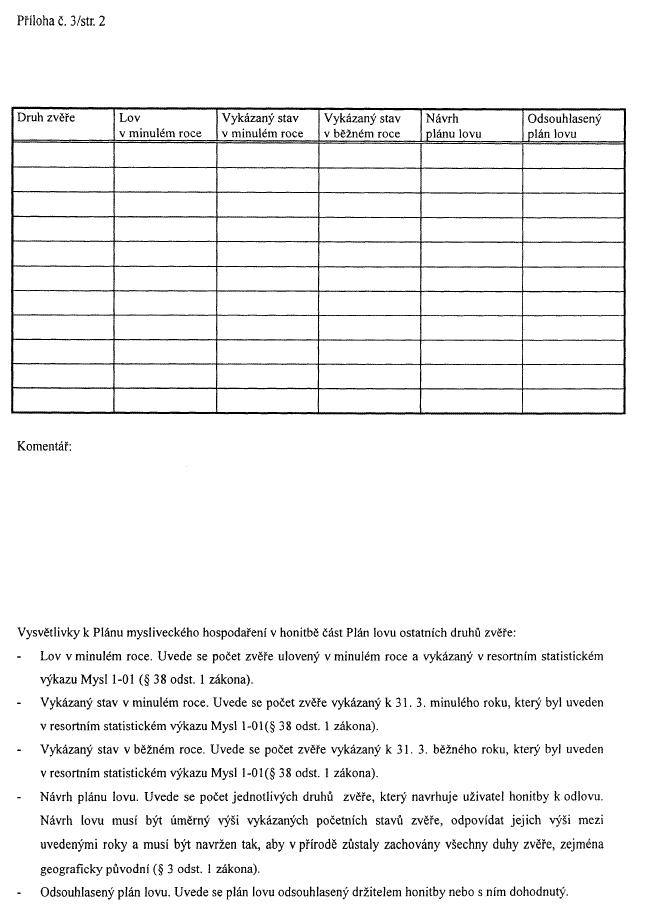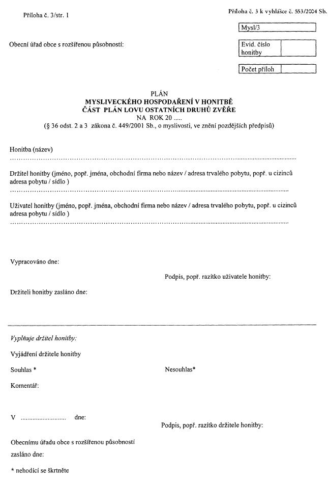 Vyhláška Ministerstva zemědělství č. 553/2004 Sb., o podmínkách, vzoru a bližších pokynech vypracování plánu mysliveckého hospodaření v honitbě