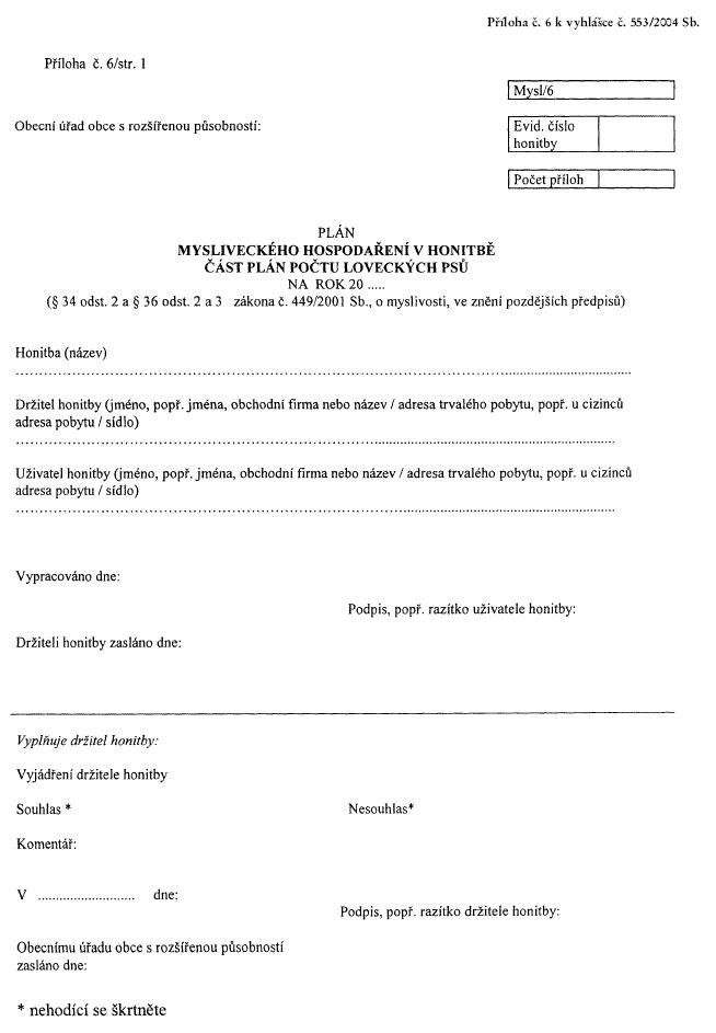 Vyhláška Ministerstva zemědělství č. 553/2004 Sb., o podmínkách, vzoru a bližších pokynech vypracování plánu mysliveckého hospodaření v honitbě