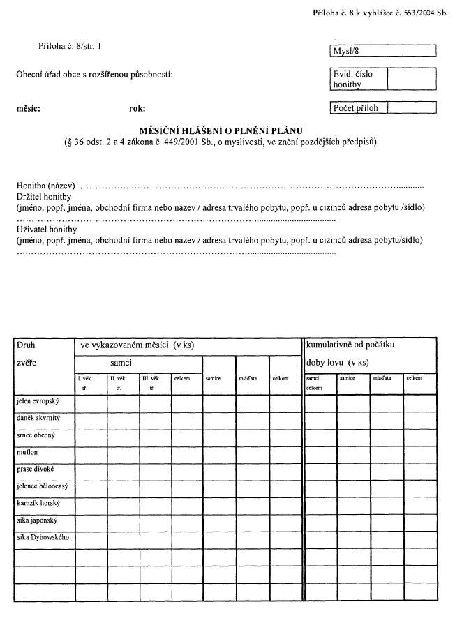 Vyhláška Ministerstva zemědělství č. 553/2004 Sb., o podmínkách, vzoru a bližších pokynech vypracování plánu mysliveckého hospodaření v honitbě