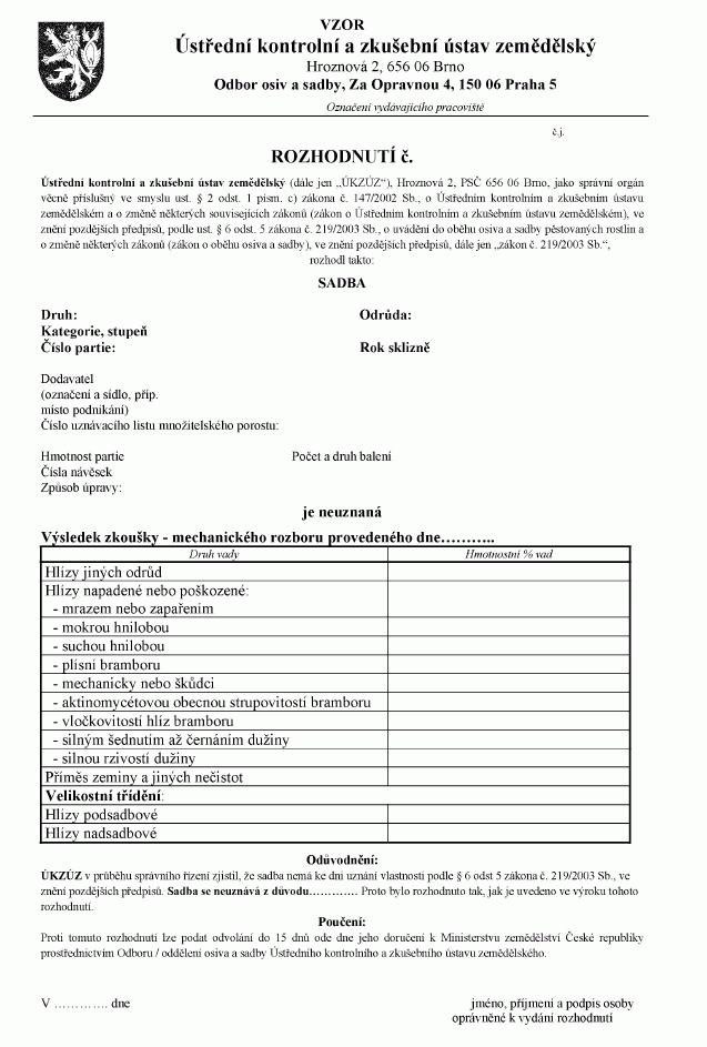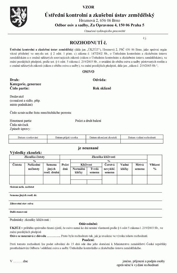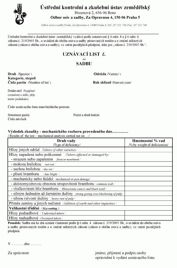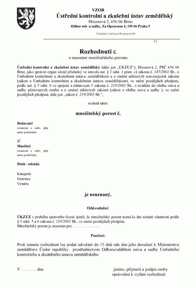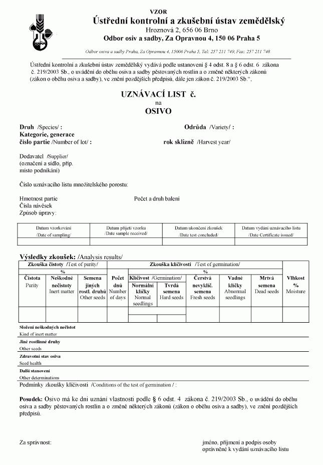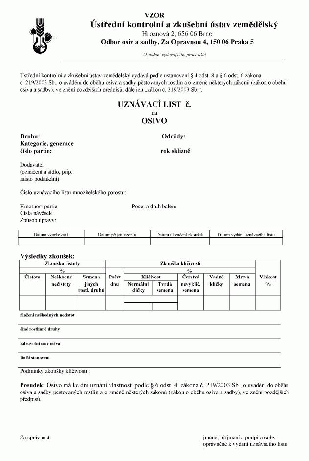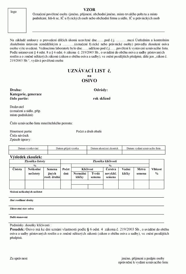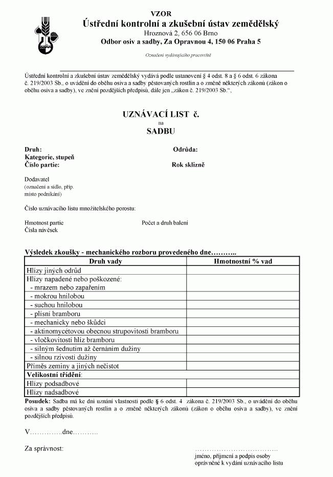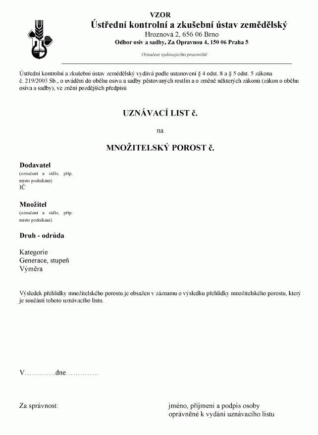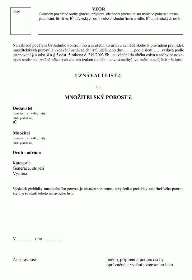 - Uznávací list na množitelský porost (pro pověřenou osobu)