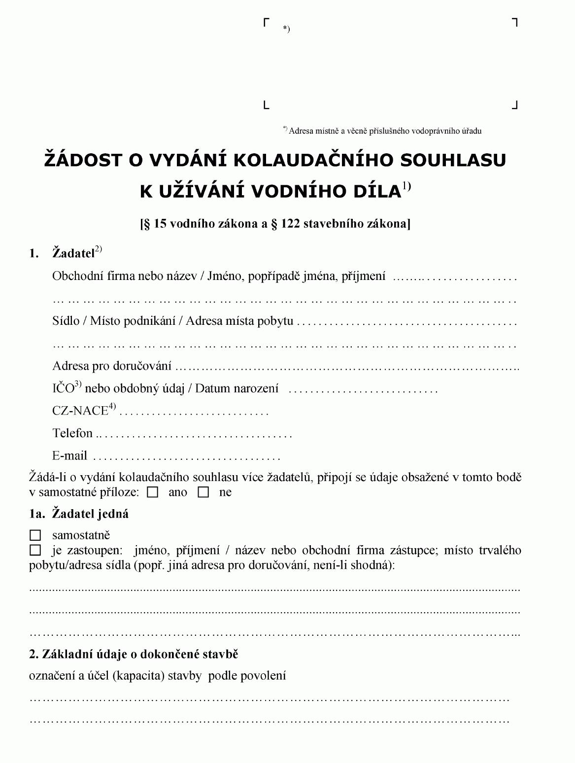 ŽÁDOST O VYDÁNÍ KOLAUDAČNÍHO SOUHLASU K UŽÍVÁNÍ VODNÍHO DÍLA1)