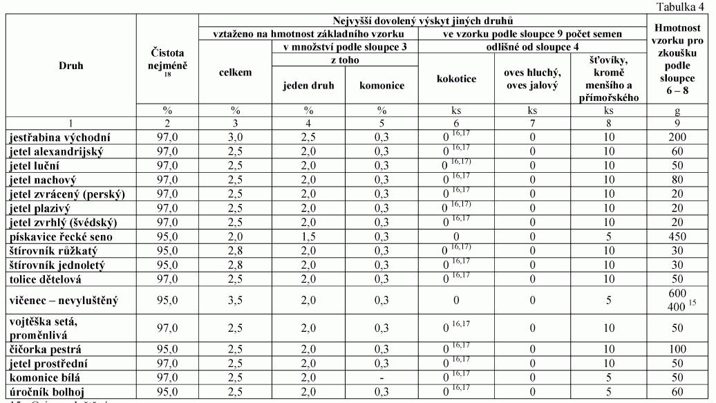 17 - Výskyt jednoho semene kokotic ve vzorku s předepsanou hmotností se nepovažuje za nečistotu,