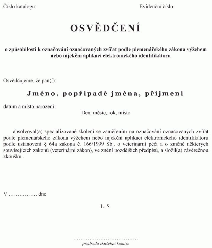 Právní předpisyVzor osvědčení o způsobilosti k označování označovaných zvířat podle plemenářského zákona výžehem nebo injekční aplikací elektronického identifikátoru