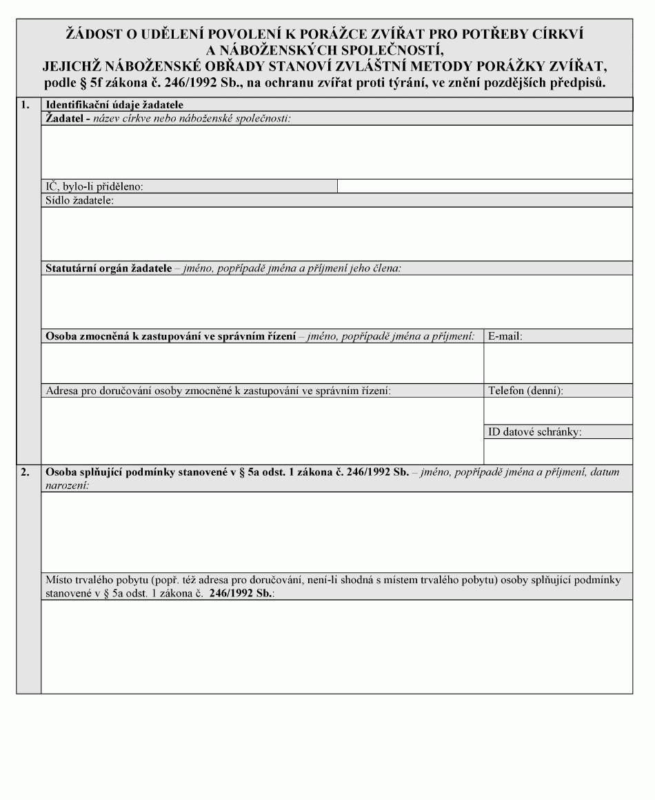 Právní předpisyVzor žádosti o udělení povolení k porážce zvířat pro potřeby církví a náboženských společností, jejichž náboženské obřady stanoví zvláštní