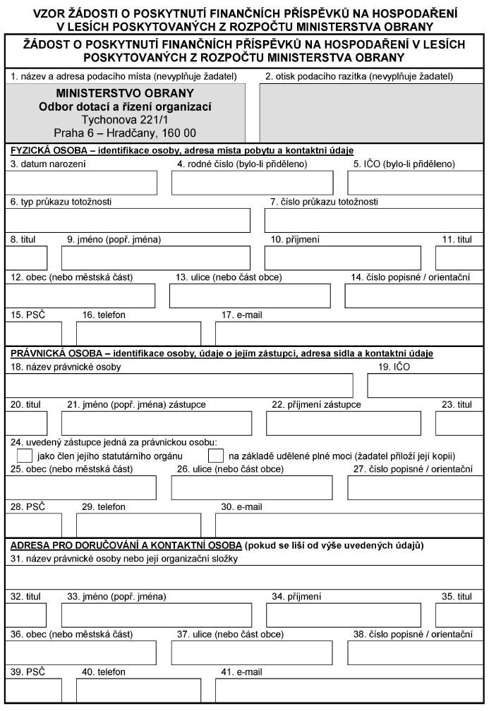 VZOR ŽÁDOSTI O POSKYTNUTÍ FINANČNÍCH PŘÍSPĚVKŮ NA HOSPODAŘENÍ V LESÍCH POSKYTOVANÝCH Z ROZPOČTU MINISTERSTVA OBRANY