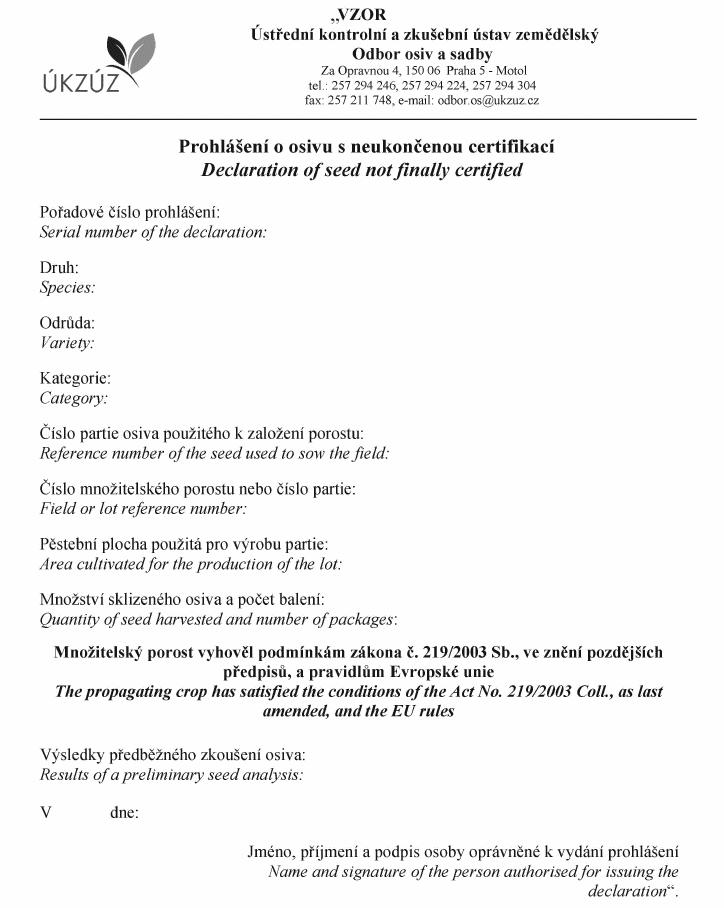 "j) pořadové číslo prohlášení o osivu s neukončenou certifikací.".
