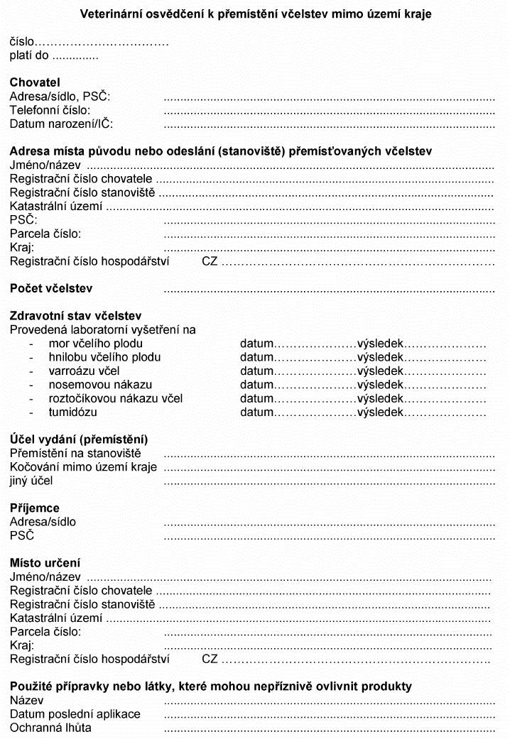 Právní předpisyVeterinární osvědčení k přemístění včelstev mimo území kraje