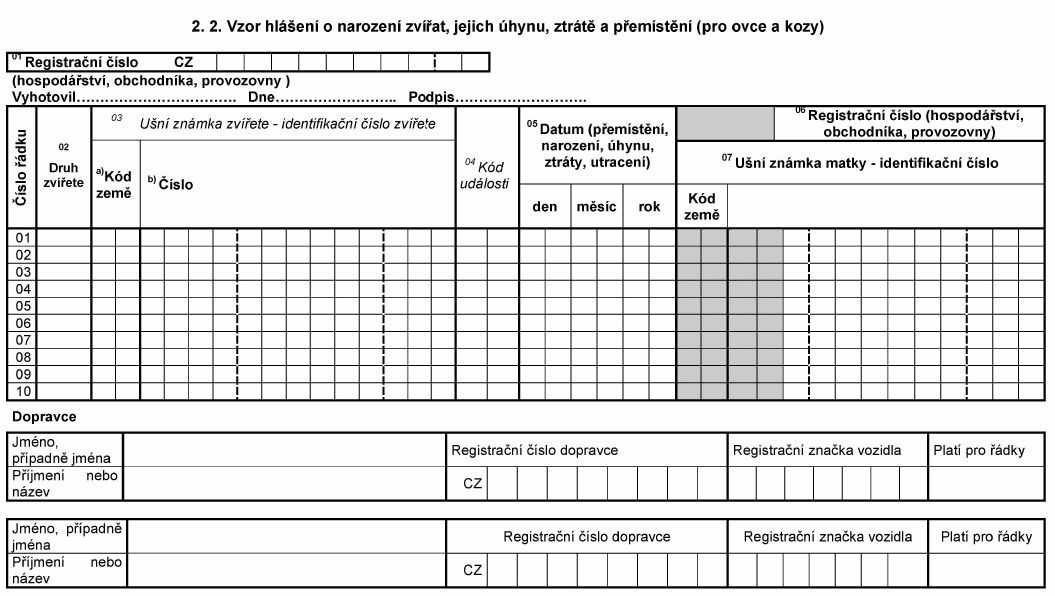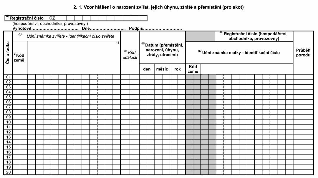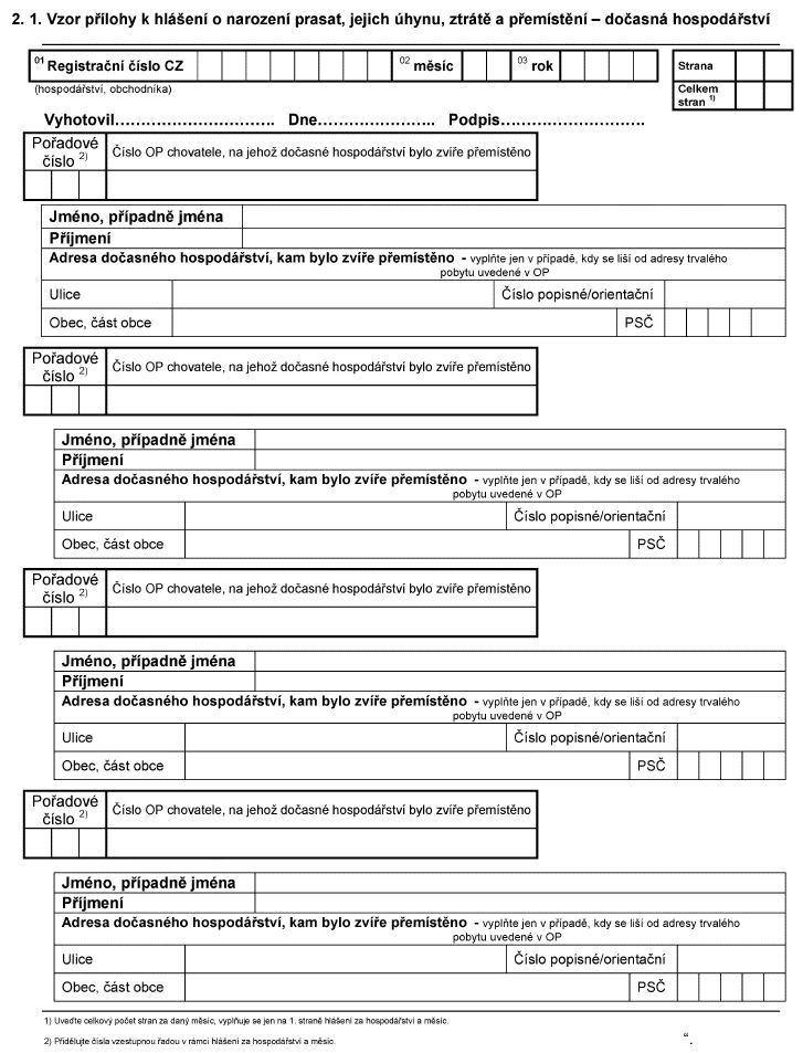 vyplněná příloha k hlášení o narození prasat, jejich úhynu, ztrátě a přemístění -
