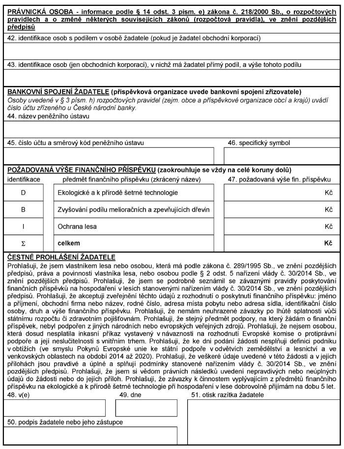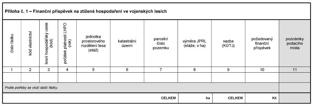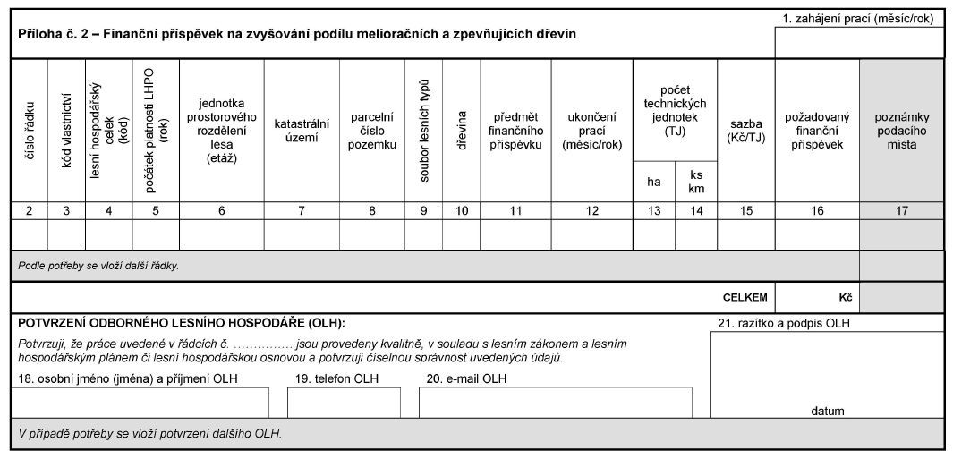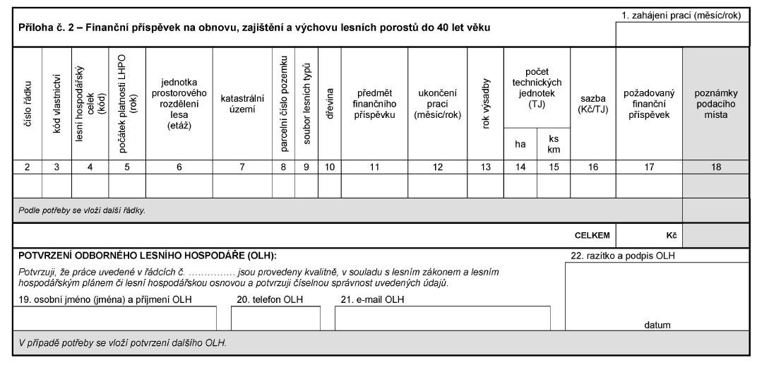 II. Sazby finančního příspěvku na obnovu, zajištění a výchovu lesních porostů do 40 let věku I-------I-----------------------------I-----------------I--------------I-----------I I Řádek I Zkrácený název příspěvku I Technické I Identifikace I Sazba I I I I jednotky I příspěvku I příspěvku I I-------I-----------------------------I-----------------I----I----I----I-----------I I 1. I Přirozená obnova a umělá I I I I I I I I obnova síjí I I I I I I I I - dřeviny meliorační a I Kč/ha I B I a I 1 I 25 000 I I I zpevňující1)I I I I I I I I - dřeviny základní cílové a I Kč/ha I B I a I 2 I 15 000 I I I přípravné1),2)I I I I I I I-------I-----------------------------I-----------------I----I----I----I-----------I I 2. I Umělá obnova sadbou první I I I I I I I I - dřeviny meliorační a I Kč/sazenici I B I b I 1 I 12 I I I zpevňující1)I I I I I I I I - dřeviny základní I Kč/sazenici I B I b I 2 I 6 I I I cílové1),3)I I I I I I I-------I-----------------------------I-----------------I----I----I----I-----------I I 3. I Umělá obnova sadbou I I I I I I I I opakovaná I Kč/sazenici I B I c I 1 I 9 I I I - dřeviny meliorační a I I I I I I I I zpevňující1)I I I I I I I I - dřeviny základní I Kč/sazenici I B I c I 4 I 6 I I I cílové1),3)I I I I I I I-------I-----------------------------I-----------------I----I----I----I-----------I I 4. I Zajištění lesních porostů I I I I I I I I - dřeviny meliorační a I Kč/ha I B I d I 1 I 34 000 I I I zpevňující1)I I I I I I I I - dřeviny základní cílové a I Kč/ha I B I d I 2 I 20 000 I I I přípravné1),2),3)I I I I I I I-------I-----------------------------I-----------------I----I----I----I-----------I I 5. I Následná péče o výsadbu I I I I I I I I - dřeviny meliorační a I Kč/ha I B I d I 3 I 12 000 I I I zpevňující1)a základní I I I I I I I I cílové1),3)I I I I I I I-------I-----------------------------I-----------------I----I----I----I-----------I I 6. I Přeměny, rekonstrukce I Kč/ha I B I e I 1 I 10 000 I I-------I-----------------------------I-----------------I----I----I----I-----------I I 7. I Výchova lesních porostů I I I I I I I I - bez zajištění rozčlenění I Kč/ha I B I f I 1 I 6 000 I I I lesního porostu I I I I I I I I - se zajištěním rozčlenění I Kč/ha I B I f I 3 I 10 000 I I I lesního porostu4)I I I I I I I-------I-----------------------------I-----------------I----I----I----I-----------I I 8. I Oplocenky I Kč/km I B I o I 1 I 50 000 I I-------I-----------------------------I-----------------I----I----I----I-----------I