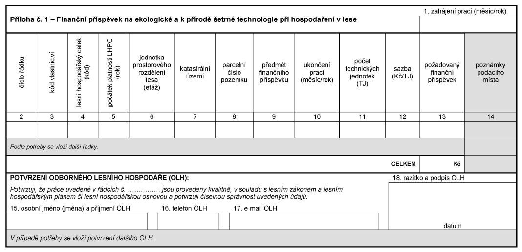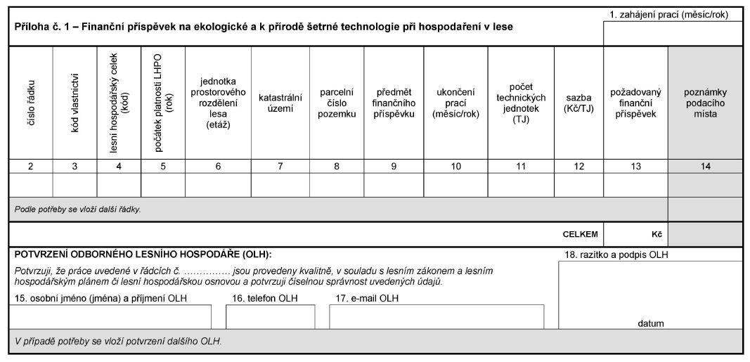 I. Sazby finančního příspěvku na ekologické a k přírodě šetrné technologie při hospodaření v lese I-------I-----------------------------I-----------I--------------I-----------I I Řádek I Zkrácený název příspěvku I Technické I Identifikace I Sazba I I I I jednotky I příspěvku I příspěvku I I-------I-----------------------------I-----------I----I----I----I-----------I I 1. I Soustřeďování dříví I Kč/m3I D I a I 1 I 80 I I I lanovkou v lese I I I I I I I-------I-----------------------------I-----------I----I----I----I-----------I I 2. I Soustřeďování dříví koněm v I Kč/m3I D I b I 1 I 80 I I I lese I I I I I I I-------I-----------------------------I-----------I----I----I----I-----------I I 3. I Soustřeďování dříví I Kč/m3I D I c I 1 I 30 I I I vyvážením v lese I I I I I I I-------I-----------------------------I-----------I----I----I----I-----------I I 4. I Štěpkování nebo drcení I Kč/ha I D I d I 1 I 18 000 I I I klestu I I I I I I I-------I-----------------------------I-----------I----I----I----I-----------I I 5. I Soustřeďování dříví I Kč/m3I D I e I 1 I 30 I I I železným koněm v lese I I I I I I I-------I-----------------------------I-----------I----I----I----I-----------I