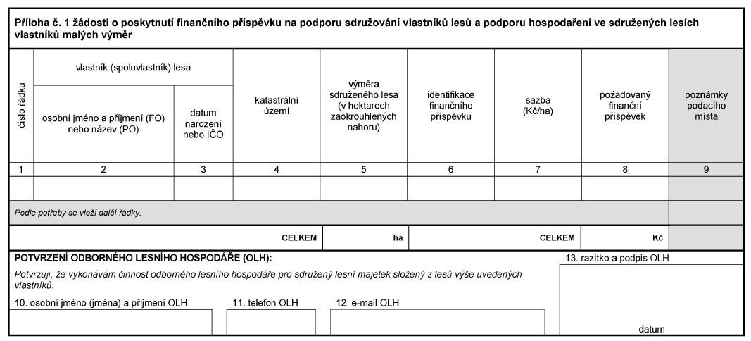 IV. Sazby finančního příspěvku na podporu sdružování vlastníků lesů a podporu hospodaření ve sdružených lesích vlastníků malých výměr I-------I---------------------I-----------I--------------I-----------------------------------------------I I Řádek I Velikost sdruženého I Technické I Identifikace I Výměra jednotlivých sdružujících se vlastníků I I I majetku I jednotky I příspěvku I------------I----------I-----------I-----------I I I I I I do 5 ha I do 50 ha I do 150 ha I do 300 ha I I I I I I------------I----------I-----------I-----------I I I I I I A I B I C I D I I-------I---------------------I-----------I----I----I----I------------I----------I-----------I-----------I I 1. I 150-500 ha I Kč/ha I C I a I 1 I 300 I 150 I 100 I - I I-------I---------------------I-----------I----I----I----I------------I----------I-----------I-----------I I 2. I 501-1000 ha I Kč/ha I C I b I 1 I 350 I 200 I 150 I 50 I I-------I---------------------I-----------I----I----I----I------------I----------I-----------I-----------I I 3. I nad 1000 ha I Kč/ha I c I c I 1 I 400 I 250 I 200 I 100 I I-------I---------------------I-----------I----I----I----I------------I----------I-----------I-----------I