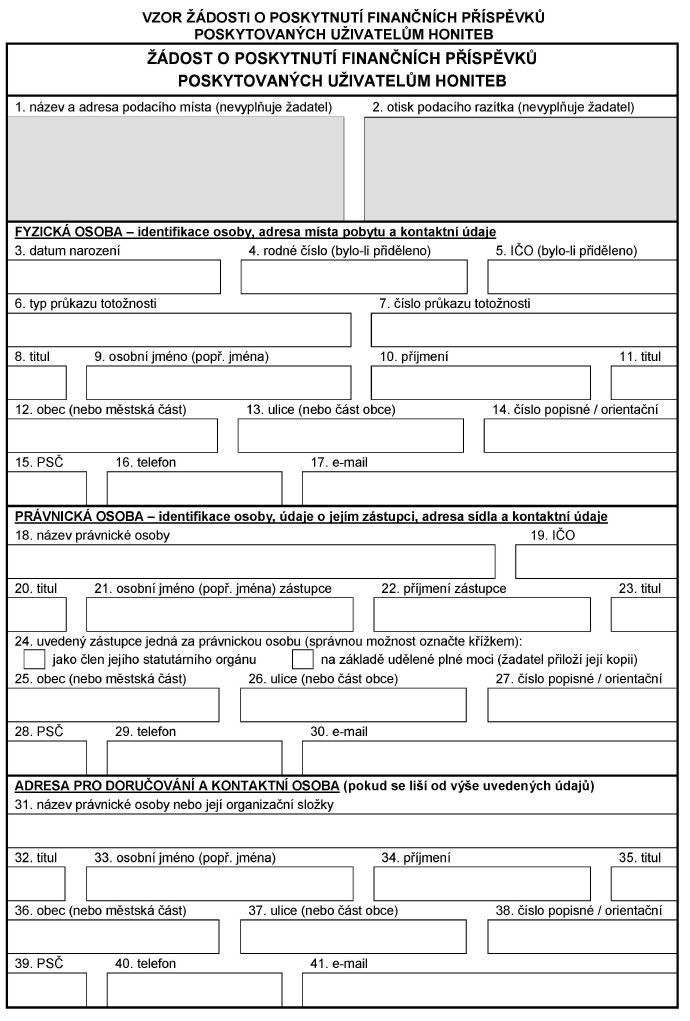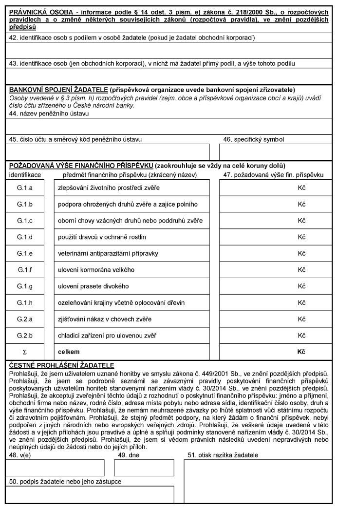 VI. Sazby finančních příspěvků poskytovaných uživatelům honiteb I-------I---------------------------------------------I-----------I--------------I-----------I I Řádek I Zkrácený název příspěvku I Technické I Identifikace I Sazba I I I I jednotky I příspěvku I příspěvku I I-------I---------------------------------------------I-----------I----I----I----I-----------I I 1. I Zlepšování životního prostředí zvěře I I I I I I I I Políčka pro zvěř I Kč/ha I G I a I 1 I 8 000 I I I Napajedla pro zvěř I Kč/ks I G I a I 2 I 1 000 I I I Betonové nory I Kč/ks I G I a I 3 I 2 000 I I I Lapací zařízení I Kč/ks I G I a I 4 I 1 000 I I I Hnízdní budky pro vodní ptáky I Kč/ks I G I a I 5 I 500 I I I Odchytová zařízení na spárkatou zvěř I Kč/ks I G I a I 6 I 16 000 I I I Krmelce pro drobnou zvěř I Kč/ks I G I a I 7 I 1 000 I I I Akusticko-světelné plašiče zvěře I Kč/ks I G I a I 8 I 2 000 I I I Krmivo pro vybrané druhy spárkaté zvěře v I I I I I I I I přezimovací obůrce I I I I I I I I - sčítaný jedinec jelena evropského I Kč/ks I G I a I 9 I 1 000 I I I - sčítaný jedinec daňka skvrnitého, siky I Kč/ks I G I a I 0 I 500 I I I japonského nebo muflona I I I I I I I-------I---------------------------------------------I-----------I----I----I----I-----------I I 2. I Podpora ohrožených druhů zvěře a zajíce I I I I I I I I polního I I I I I I I I Vypuštění tetřeva hlušce I Kč/ks I G I b I 1 I 8 000 I I I Vypuštění tetřívka obecného I Kč/ks I G I b I 2 I 5 000 I I I Vypuštění koroptve polní I Kč/ks I G I b I 3 I 250 I I I Vypuštění zajíce polní I Kč/ks I G I b I 4 I 1 500 I I I Přenosné přístřešky pro koroptve I Kč/ks I G I b I 5 I 200 I I-------I---------------------------------------------I-----------I----I----I----I-----------I I 3. I Oborní chovy zvěře se vzácnými druhy nebo I I I I I I I I poddruhy I I I I I I I I Koza bezoárová I Kč/ks I G I c I 1 I 1 500 I I I Bílý jelen I Kč/ks I G I c I 2 I 1 500 I I-------I---------------------------------------------I-----------I----I----I----I-----------I I 4. I Veterinární antiparazitické přípravky I Kč/kg I G I e I 1 I 200 I I-------I---------------------------------------------I-----------I----I----I----I-----------I I 5. I Ulovení kormorána velkého I Kč/ks I G I f I 1 I 500 I I-------I---------------------------------------------I-----------I----I----I----I-----------I I 6. I Ulovení prasete divokého I Kč/ks I G I g I 1 I 2 000 I I-------I---------------------------------------------I-----------I----I----I----I-----------I I 7. I Ozeleňování krajiny včetně oplocování I I I I I I I I dřevin I I I I I I I I - výsadba keřů I Kč/ks I G I h I 1 I 50 I I I - výsadba a ochrana poloodrostků I Kč/ks I G I h I 2 I 80 I I I - výsadba a ochrana odrostků I Kč/ks I G I h I 3 I 100 I I-------I---------------------------------------------I-----------I----I----I----I-----------I