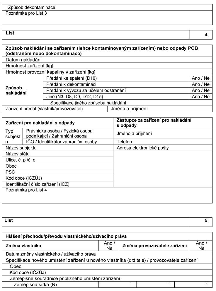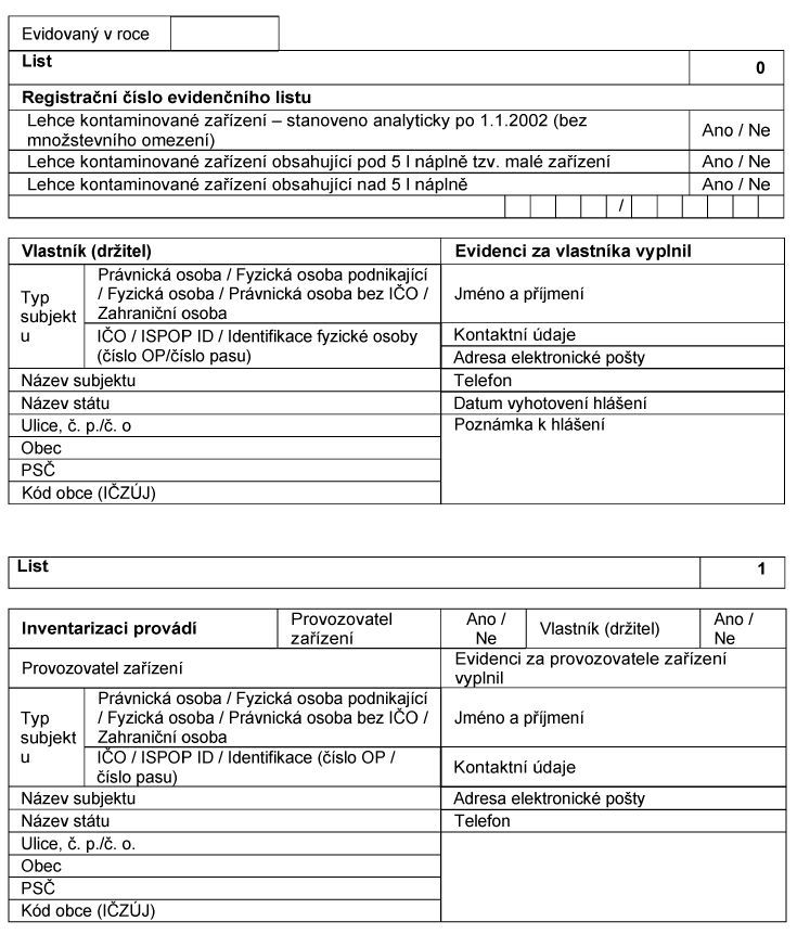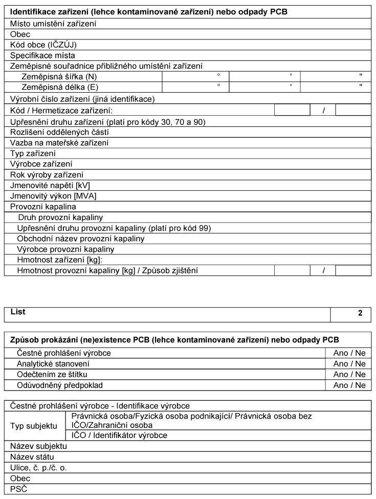 Evidenční list pro inventarizaci zařízení obsahujících polychlorované bifenyly