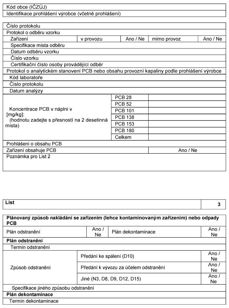I----------------------------I-----------------------------------------------I I Registrační číslo I Způsob prokazování přítomnosti PCB I I evidenčního listu I v zařízeních I I----------------------------I-----------------------------------------------I I čtyřmístné identifikační I Analytickým stanovením po 1. 1. 2002 (v I I číslo osoby provádějící I registrované laboratoři rozhodčí analytickou I I odběr vzorku / šestimístné I metodou podle ČSN EN 61619 Izolační kapaliny I I pořadové číslo vzorkovnice I - Kontaminace polychlorovanými bifenyly (PCB) I I (údaje na lepicím štítku I - Stanovení metodou kapilární plynové I I na vzorkovnici, ne číslo I chromatografie), což znamená, že údaje I I přidělené laboratoří) I "Identifikační číslo osoby provádějící odběr" I I I a "Kód laboratoře" jsou známé. I I----------------------------I-----------------------------------------------I I 6666/...... (šestičíslí se I Jedná se o zařízení obsahující pod 5 l I I nevyplňuje) I náplně, tzv. malá zařízení, kde provozní I I I kapaliny obsahují 50-500 mg/kg PCB. Existence I I I PCB se prokazují čestným prohlášením, I I I analytickým stanovením nebo odečtením ze I I I štítku. I I----------------------------I-----------------------------------------------I I 5555/...... (šestičíslí se I Jedná se o zařízení obsahující nad 5 l I I nevyplňuje) I náplně, kde provozní kapaliny obsahují 50-500 I I I mg/kg PCB. Existence PCB se prokazují I I I analytickým stanovením nebo odůvodněným I I I předpokladem. I I----------------------------I-----------------------------------------------I