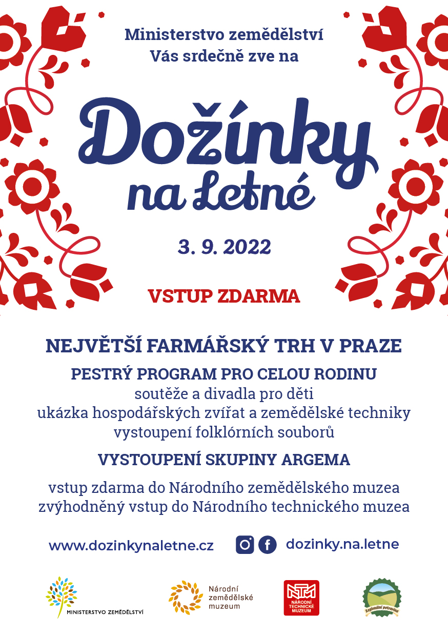 Ministerstvo zemědělství Vás srdečně zve na Dožínky na Letné - největší farmářský trh v Praze. Čeká Vás pestrý program pro celou rodinu, včetně soutěží a divadla pro děti, ukázky hospodářských zvířat a zemědělské techniky nebo například vstup zdarma do Národního zemědělského muzea a zvýhodněný vstup do Národního technického muzea.
