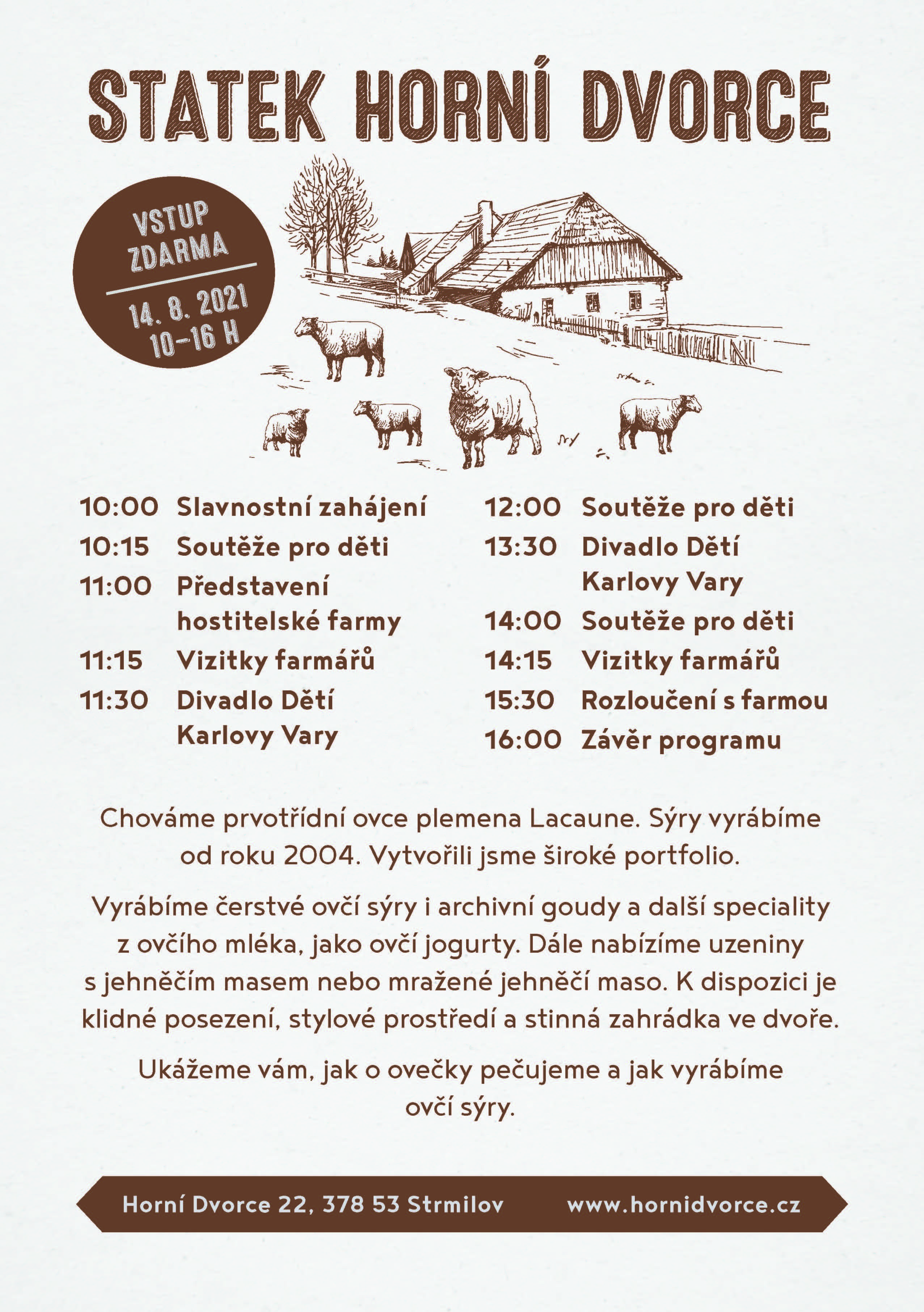 Na farmě v rámci akce můžete spolu se svými dětmi zažít spoustu zábavy, ochutnat i nakoupit čerstvé ovčí sýry a speciality z ovčího mléka a masa, poznat blíže farmu a také se seznámit s chovem oveček a výrobou ovčího sýra.