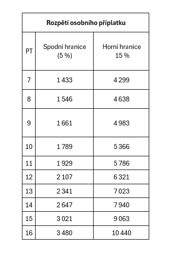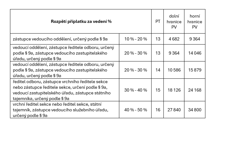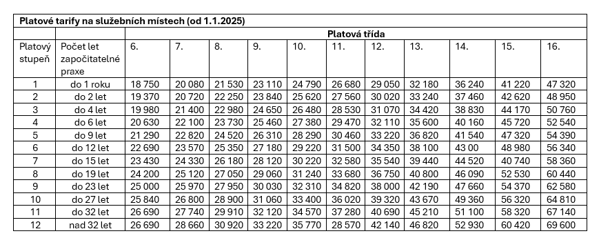 Tabulku s výšemi platového tarifu pro zaměstnance na služebních místech naleznete v tabulce níže a pro zaměstnance na pracovních místech naleznete v příloze č.1 nařízení vlády č. 341/2017 Sb., o platových poměrech zaměstnanců ve veřejných službách a správě, ve znění pozdějších předpisů.