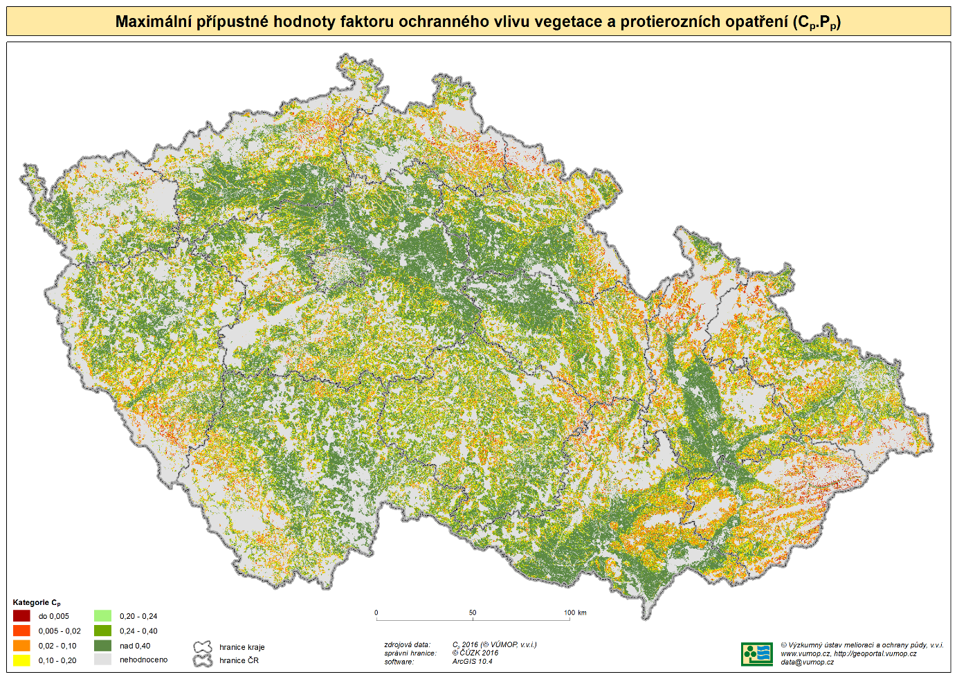 Ohroženost půdy vodní erozí je vyjádřena vrstvou Maximální přípustné hodnoty faktoru ochranného vlivu vegetace a protierozních opatření Cp.Pp (Tab. 1, Obr. 1), která vychází z Univerzální rovnice ztráty půdy USLE (Wischmeier, Smith, 1978). Vrstva využívá regionalizovaný faktor erozní účinnosti přívalového deště R a přípustný smyv je nastaven pro středně hluboké (30−60 cm) a hluboké půdy (nad 60 cm) na hodnotu 8 t.ha-1.rok-1, mělké půdy (do 30 cm) na hodnotu 1 t.ha-1.rok-1.