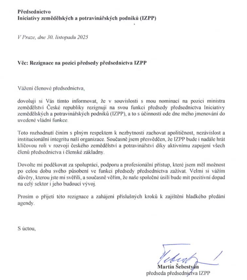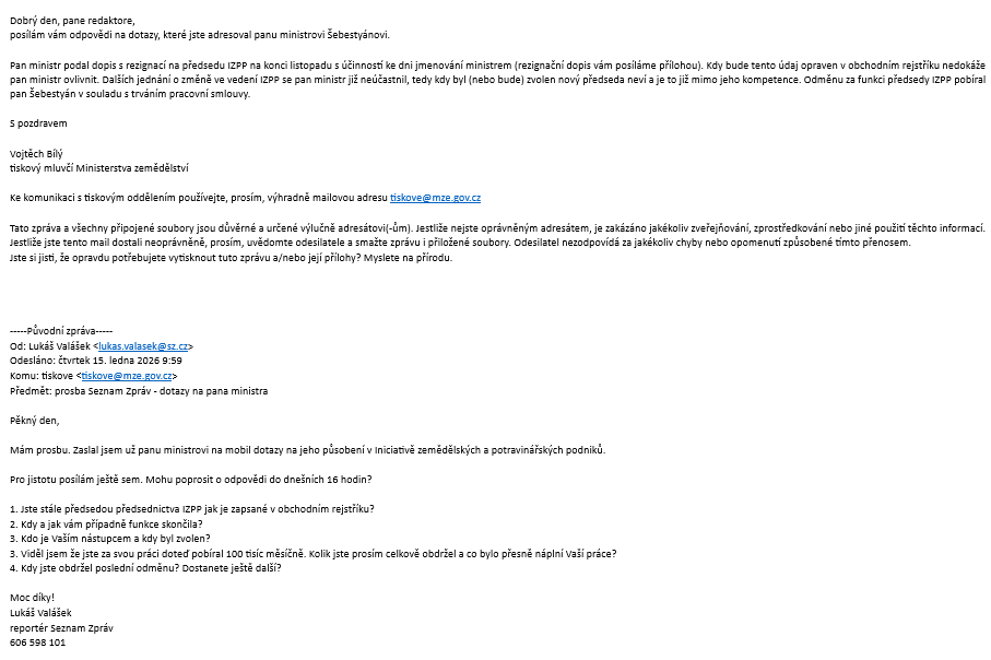 - …mluvčí Ministerstva zemědělství Vojtěch Bílý však přišel s tím, že ministr zemědělství už funkci u zemědělské a potravinářské lobby položil. (Mluvčí MZe s ničím nepřišel, redakci poskytnul jasnou odpověď, že ministr již na pozici předsedy IZPP rezignoval dopisem z 30. 11. 2025)