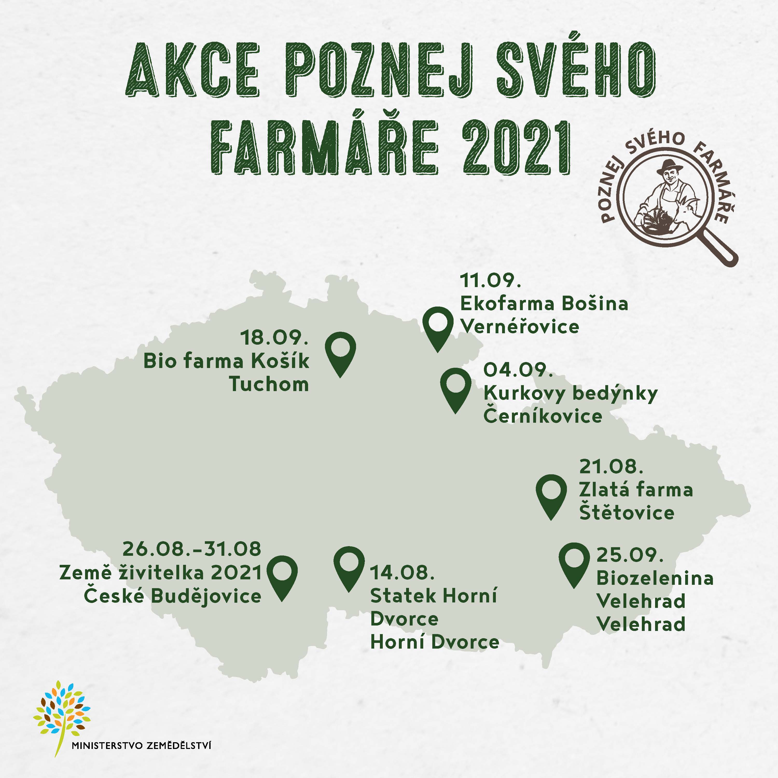 Letos začíná projekt Ministerstva zemědělství Poznej svého farmáře 14. srpna na statku v Horních Dvorcích v jižních Čechách, kde vyrábějí ovčí sýry a ostatní potraviny z produkce vlastního stáda. Další akce pro veřejnost se budou konat na hospodářstvích s chovem skotu, koz nebo na ekofarmách, kde pěstují bio zeleninu a bio ovoce. Postupně tak návštěvníci budou moci poznat Zlatou farmu na Olomoucku (21. 8.), Kurkovy bedýnky na Královéhradecku (4. 9.), Ekofarmu Bošina na Královéhradecku (11. 9.), Farmu Košík ve Středních Čechách (18. 9.) a Biozeleninu Velehrad na Zlínsku (25. 9.). Zářijové akce Poznej svého farmáře se budou konat na ekofarmách a navážou tak na tradiční kampaň Září – měsíc biopotravin a ekozemědělství. Od 26. do 31. srpna se mohou lidé seznámit s projektem Poznej svého farmáře i přímo na výstavě Země živitelka v Jihočeském kraji, který bude tentokrát zaměřený především na zábavné vzdělávací hry pro děti.