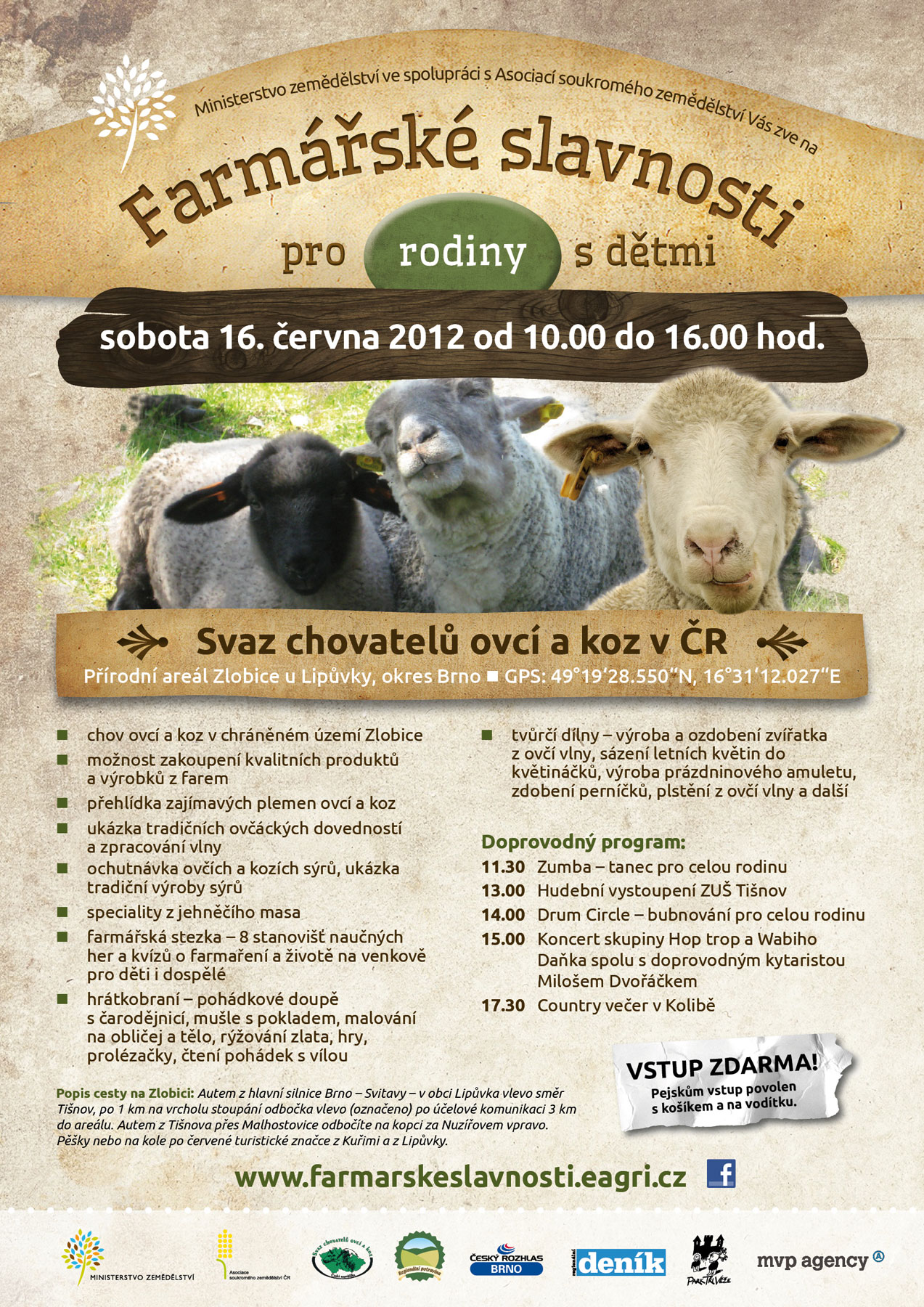 „O areál Zlobice se v současnosti stará Svaz chovatelů ovcí a koz v České republice. Návštěvníci Farmářských slavností se budou moci seznámit se zdejším chovem koz a ovcí, poznají jejich plemena a uvidí tradiční ovčácké dovednosti a zpracování vlny. Mohou se těšit i na ochutnávku ovčích a kozích sýrů a speciality z jehněčího masa,“ uvedl Josef Stehlík, předseda Asociace soukromého zemědělství ČR. Pořadatelé připravili pro návštěvníky také doprovodný program. Děti si mohou v dílnách vyzkoušet plstění z ovčí vlny, ozdobit si perník nebo vyrobit amulet pro štěstí. Znalosti a smysly si zase otestují na farmářské stezce s tematikou venkova, pěstování rostlin a chovu zvířat. Na závěr si budou moci vyrýžovat zlato, zabubnovat se šamanem nebo zatančit zumbu. Součástí celodenní akce, která odstartuje v 10 hodin, bude hudební vystoupení žáků Základní umělecké školy Tišnov a koncert skupiny Hop trop a Wabiho Daňka. Pomyslnou tečkou za prvními Farmářskými slavnostmi na Moravě bude country večer v místní Kolibě.