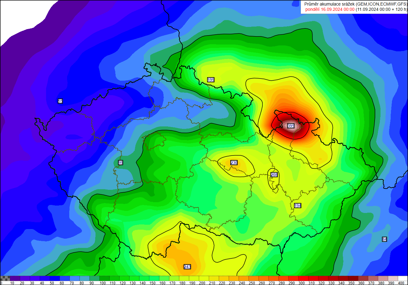 Tisková zpráva — Českou republiku zasáhnou od půlnoci na čtvrtek 12. září vydatné srážky, které se na našem území udrží až do konce týdne. Nejvíce by mělo pršet během soboty. Výstraha na extrémní srážky platí kromě Karlovarského a části Ústeckého kraje pro celé území České republiky. Nejvydatnější srážky předpokládají modely do nedělního večera v pásu od Novohradských hor přes Vysočinu až po Jeseníky. Zejména na severním a severozápadním návětří Jeseníků dávají modely extrémní srážkové úhrny přes 300 milimetrů za čtyři dny.