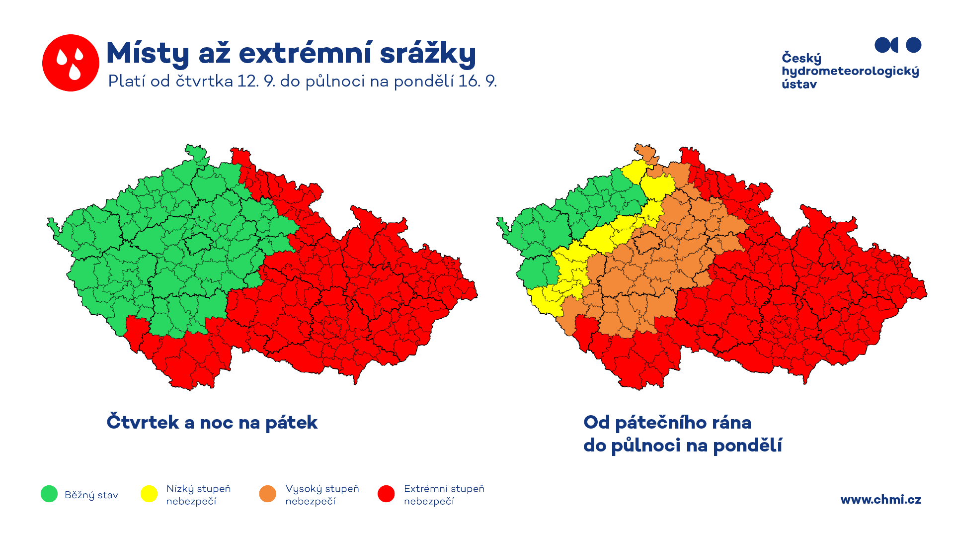 Tisková zpráva — Českou republiku zasáhnou vydatné srážky, které se na našem území udrží až do konce týdne. Dnešní predikce Českého hydrometeorologického ústavu rozšířila výstrahu před extrémními srážkami zhruba o 50 km více k západu, zejména v oblasti Šumavy. Výstraha na extrémní srážky platí kromě Karlovarského a části Ústeckého kraje pro celé území České republiky. Nejvydatnější srážky předpokládají modely do nedělního večera v pásu od Novohradských hor přes Vysočinu až po Jeseníky. Kvůli nebezpečí povodní se dnes sešla Ústřední povodňová komise, která řídí ochranu území v případě povodní. Ta doporučuje od pátečního poledne omezit akce pro veřejnost a také nechodit do lesů, kde hrozí pády stromů.