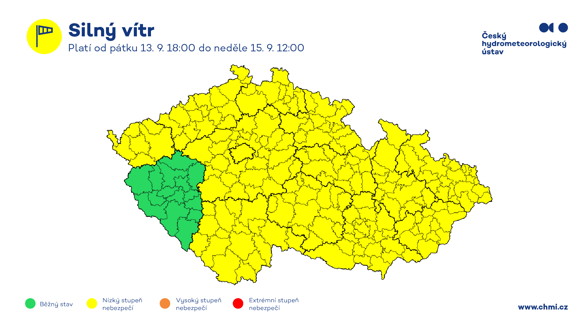 Od pátku 13. 9. bude také platit výstraha před silným větrem, Ústřední povodňová komise proto doporučuje nevstupovat do lesů a parků s ohledem na výstrahu před pády stromů.