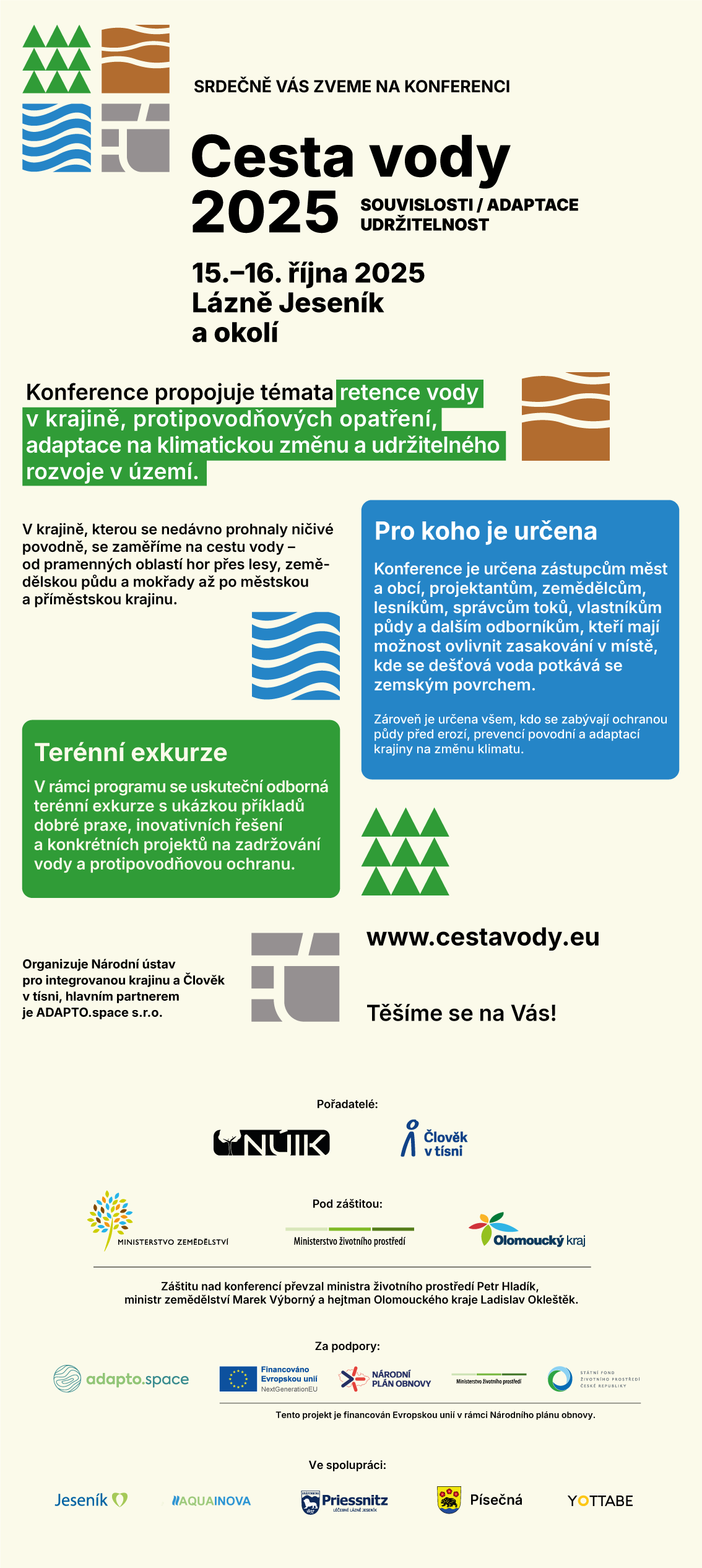 Konference se odehraje v krajině, kterou se v minulém roce prohnaly ničivé povodně, což podtrhuje její aktuálnost a naléhavost. Láká na dvoudenní program zahrnující odborné přednášky, diskuse a praktické ukázky opatření přímo v terénu. Událost zahájí vedoucí oddělení klimatické změny Českého hydrometeorologického ústavu Radim Tolasz a vystoupí na ní řada dalších hostů.