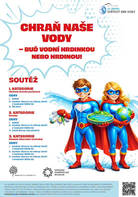 Ministerstvo zemědělství vyhlašuje u příležitosti Světového dne vody 2026, který se slaví z iniciativy OSN na celém světě, výtvarnou soutěž určenou pro všechny žáky základních škol a nižších tříd víceletých gymnázií a pro žáky škol se speciálně vzdělávacími potřebami.