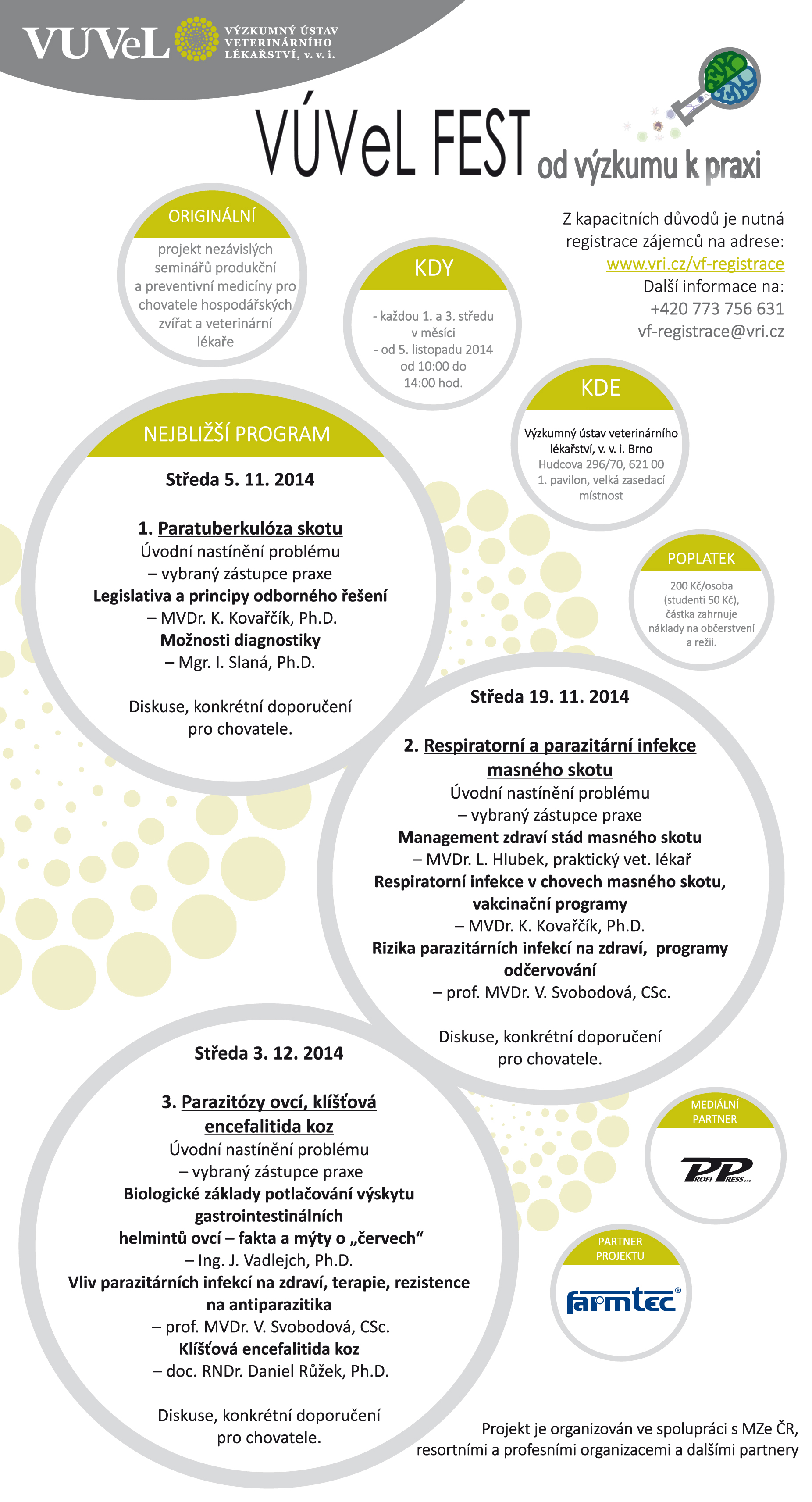 První seminář proběhne 5. 11. 2014 a bude zaměřen na problematiku paratuberkulózy v chovech dojeného skotu, druhý seminář proběhne 19. 11. 2014 a bude se věnovat respiratorním a parazitárním infekcím masného skotu a 3. 12. 2014 se uskuteční třetí seminář se zaměřením na parazitární infekce a klíšťovou u malých přežvýkavců.