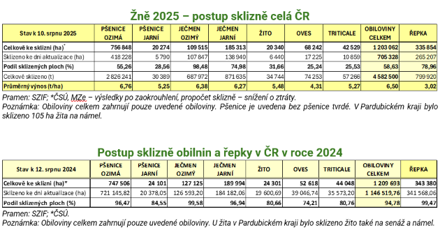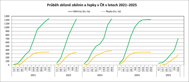 Postup sklizně obilnin a řepky v České republice k 10. srpnu 2025