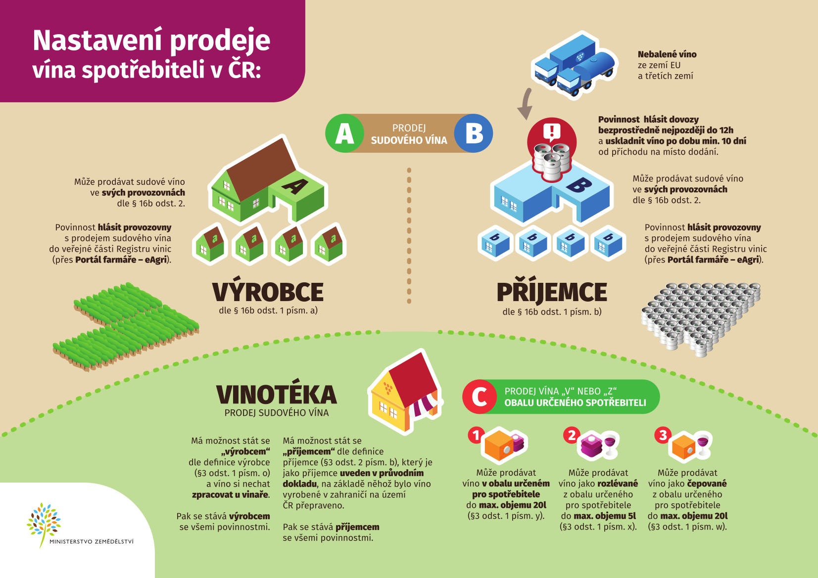 - Příjemce nebaleného vína podle § 16b odst. 1 zákona č. 321/2004 Sb. nejpozději v den zahájení a ukončení prodeje sudového vína v provozovnách uvedených v § 16b odst. 2 zákona č. 321/2004 Sb. oznámí tuto skutečnost Ústřednímu kontrolnímu a zkušebnímu ústavu zemědělskému prostřednictvím Registru vinic.
